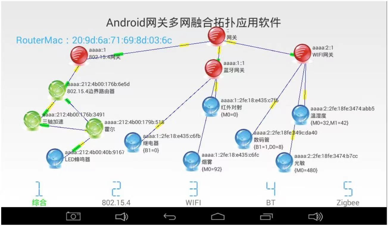 能够将蓝牙、WiFi、IEEE802.15.4 无线网络经IPV6 协议融合在一个拓扑图中,Zigbee 节点经ZStack 协议展示在拓扑图中;在界面上显示蓝牙、WiFi、RPL802.15.4、ZigBee 等节点的传感器数据或执行器状态;网关界面可显示传感器采集的数据、执行器的状态,显示蓝牙、WiFi、IEEE802.15.4 传感器节点的 IPv6 地址,显示ZigBee 传感器节点组网短地址,能够随意拖动传感器,而不改变网络的拓扑结构;点击网关上传感器节点图标,可进入二级界面查看传感器的实时曲线走势,或手动控制执行器的开关。 |