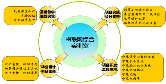 立足信息化技术,紧跟国内外物联网、大数据、云计算相关领域的先进技术,按照高标准、重实用、可发展的要求,通过构建的物联网基础实验环境、课程实训环境、科研创新开发环境、应用创新开发环境、虚拟云计算环境、创新创客实训环境等,建设“巩固教学、学做同行、学科竞赛、科研创新、服务毕设”等递增型、全方位的实验室解决方案,为促进物联网专业人才的培养、人才与产业链的无缝接轨提供支撑。