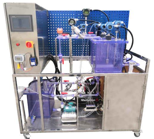 实训台以水、气/汽、电能耗监测为背景,采用液位计、流量计、温度变送器、压力变送器、电磁阀、水泵、气泵、电气控制箱、水箱等装置模拟工业场景下的水循环、气循环、电能监测常见的过程控制系统。其中水箱作为液体盛放和气体导入的气液混合容器,模拟化工行业常见的化工产品制备工艺场景。通过现场监控装置及传输模块,将液位、流量、压力、水温、气温、电压、电流、电量等过程控制参数进行数据采集,传输到能源管理平台,达到工业水、汽、气、电等至少三种数据采集控制、数据传输、数据存储、数据分析及可视化展示的目的。