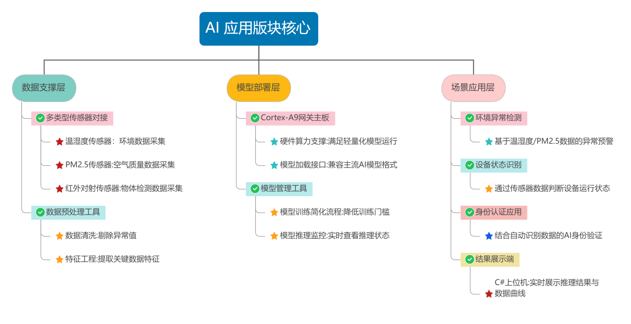 AI 学习的核心在于 “理论 + 实践” 的结合,F-Table 为 AI 应用提供了从数据采集到模型部署的全流程支持。依托平台丰富的传感器模块(如温湿度、PM2.5、红外对射传感器等),学习者可采集真实场景数据,用于机器学习数据集构建;通过智能网关系列的 Cortex-A55 网关主板,可部署轻量化 AI 模型(如环境异常检测、设备状态识别等),实现 “边缘计算 + AI 推理” 的落地实践。