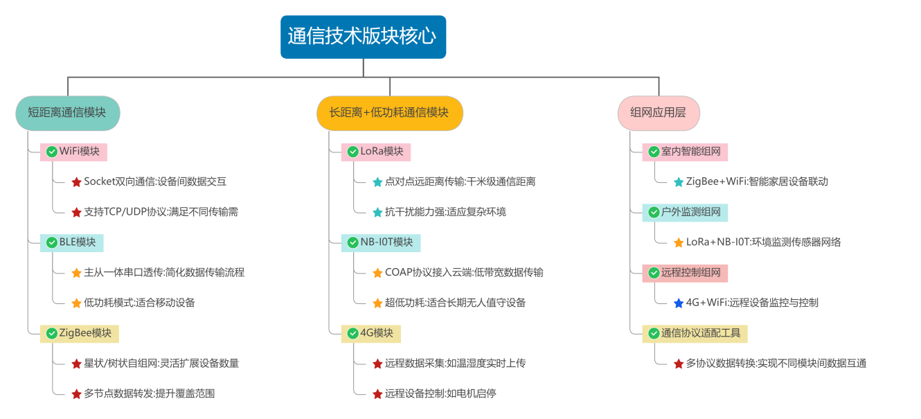 短距离通信:通过 WiFi 模块实现 Socket 双向通信,BLE 模块完成主从一体串口透传,ZigBee 模块搭建星状 / 树状自组网,适用于室内智能场景(如智能家居设备联动);