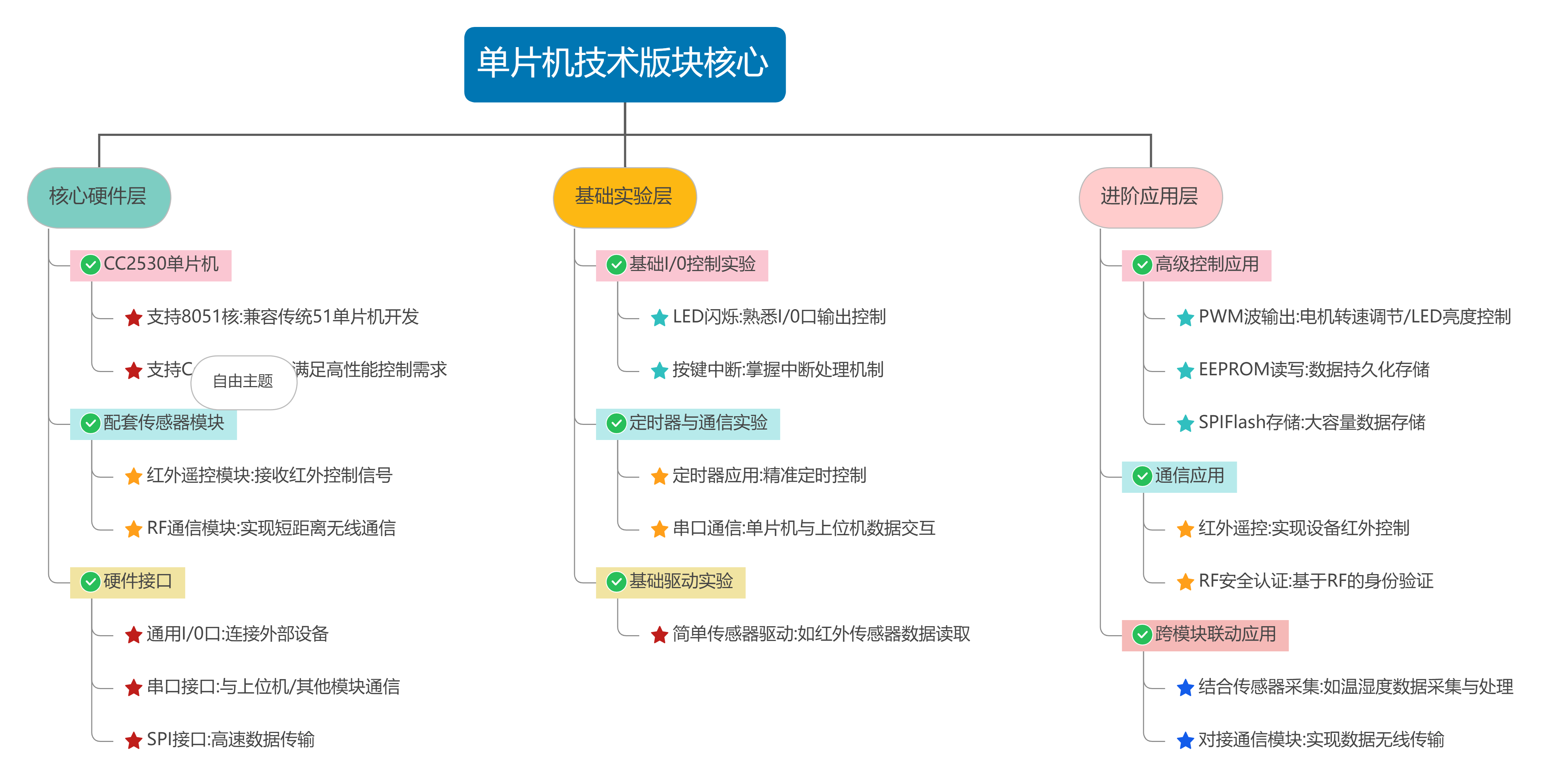 入门阶段:通过单片机技术、传感器采集版块,掌握硬件控制与数据采集的基础逻辑,完成 LED 闪烁、温湿度采集等简单实验;