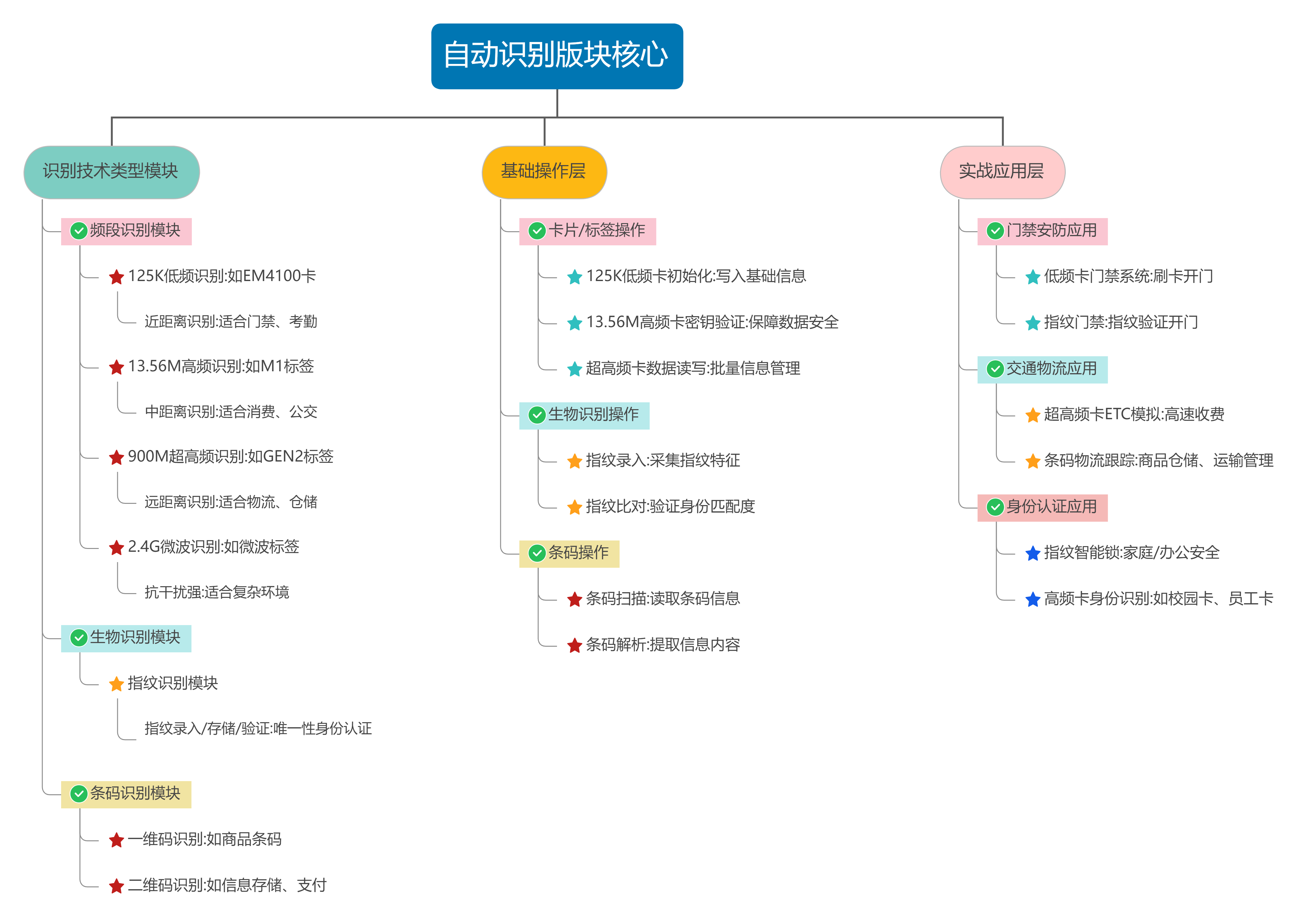 实验内容从基础的卡片读写(如 125K 低频卡初始化、13.56M 高频卡密钥验证),到综合应用(如低频卡门禁系统、超高频卡 ETC 模拟、指纹智能锁),学习者可掌握不同频段识别技术的原理与应用场景,为 AI 的 “图像识别”“身份认证” 等功能提供技术补充。