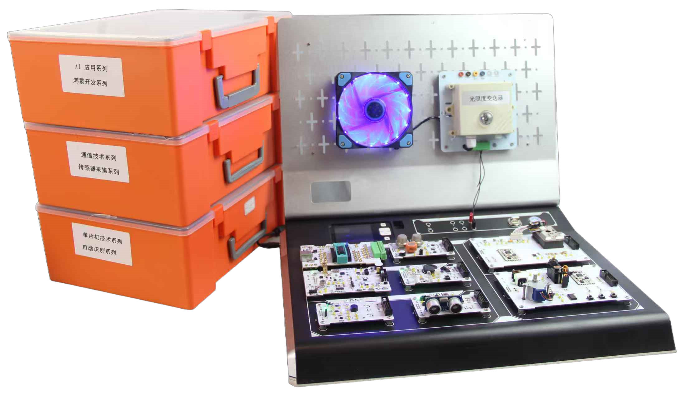 每个传感器模块均支持 Cortex-M3 内核控制,学习者可通过实验掌握传感器原理与数据采集方法:例如利用温湿度传感器采集环境数据,通过折线图实时展示;通过超声波传感器开发倒车雷达项目;结合称重传感器实现重量阈值报警等。这些实验不仅为 AI 学习提供真实的数据源,更能培养学习者的 “感知层设计思维”。