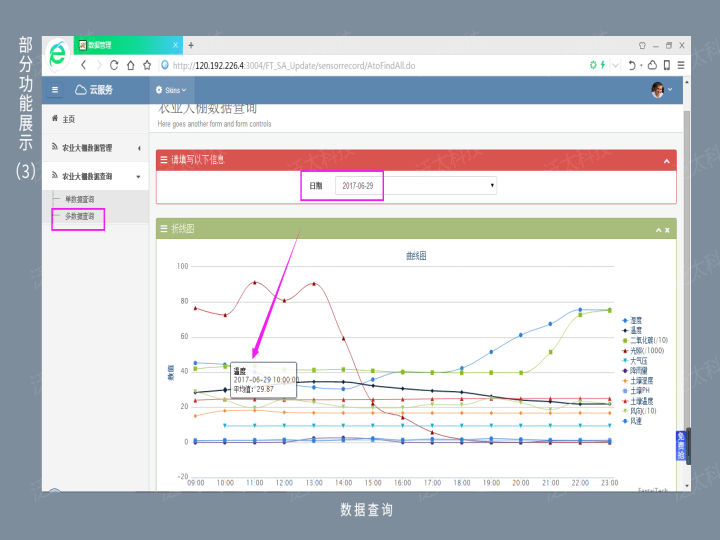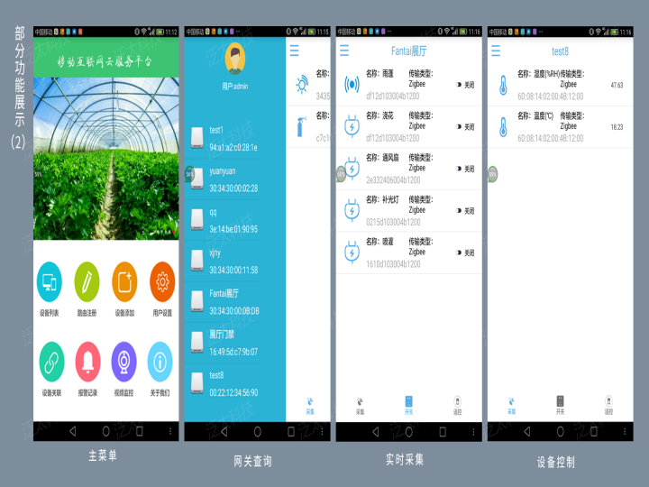 系统定时采集大棚内空气温湿度、光照度、土壤湿度、二氧化碳浓度等数据,经过无线传感网传送给物联网网关。系统会在环境参数超过预设值时进行联动处理,如控制通风扇、补光灯、滴灌、遮阳帘等执行器,调整大棚内环境或提前预警。系统将农业环境信息通过以太网、移动网络或窄带广域网传送给农业云服务平台进行存储、统计分析,以WEB页面集中展示农业生产环境的实时数据、趋势走向、设备状态等。同时,系统支持视频采集,用户可通过物联网网关、移动终端浏览农业现场视频。