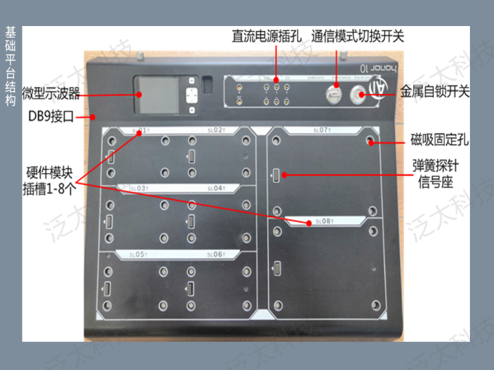 平台结构符合人体工学设计,由分离式基座和网板组成。硬件模块采用磁吸方式与基座连接固定,接触式探针进行供电和信号传输,使用方便,不易损坏管脚,易于拓展。场景引入式教学模式和丰富的教学资源,既可以支撑单个模块单一知识点的学习,也支持多个模块自由组合进行多个知识点的综合应用。
