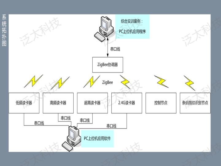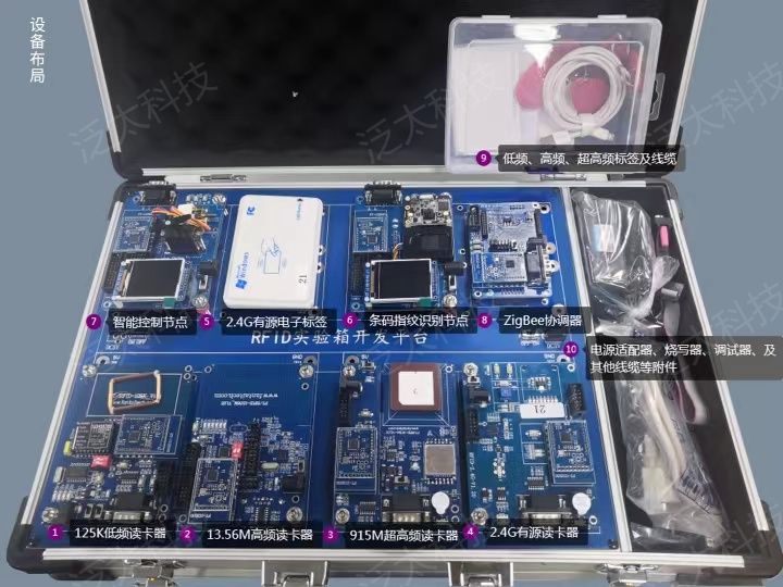 该产品包含125KHz低频模块、13.56MHz高频模块、915MHz超高频模块、2.4GHz有源读写模块、条码指纹节点、智能电机控制节点、以及ZigBee协调器。实验课程重点放在对各个频段RFID模块的管理、控制和上位机程序的应用开发上,学生可以利用开放的通信协议,使用上位机编程语言(C#)编写上位机应用程序与RFID模块、二维码指纹识别节点、智能控制板进行数据交互,实现各种物联网应用场景。产品外观如图所示。