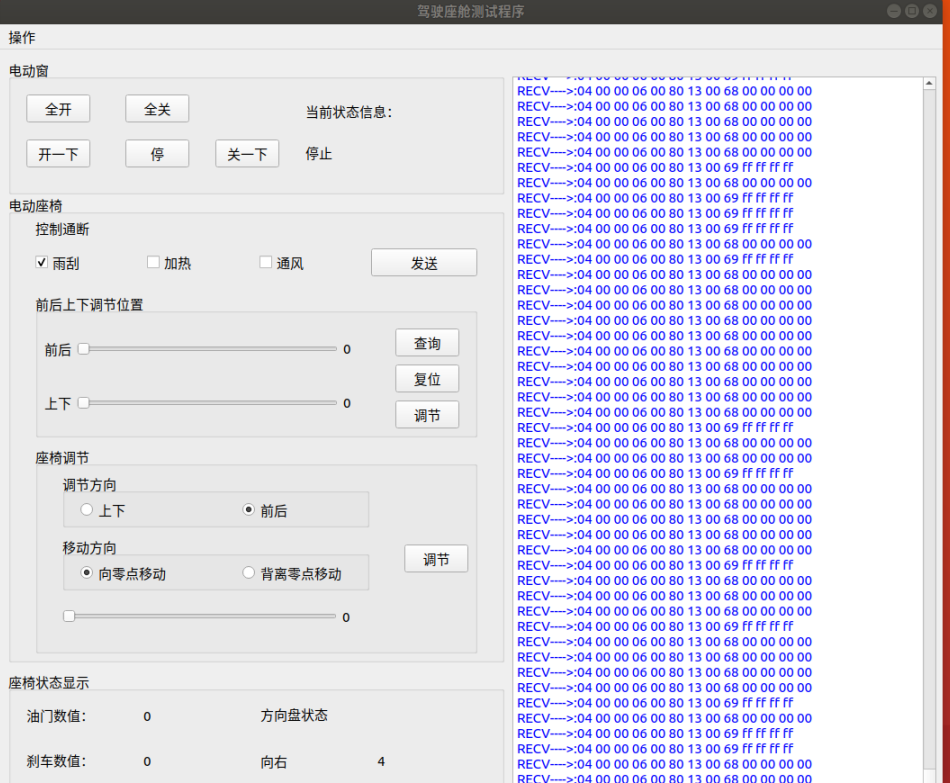 舱体,安装了单台主驾驶座椅、雨刮及电机、车窗及电机、方向盘、刹车踏板、加速踏板和座舱线控制器,通过座舱线控制器,接入到系统的CAN总线中,支持使用CAN分析工具测试舱体设备。