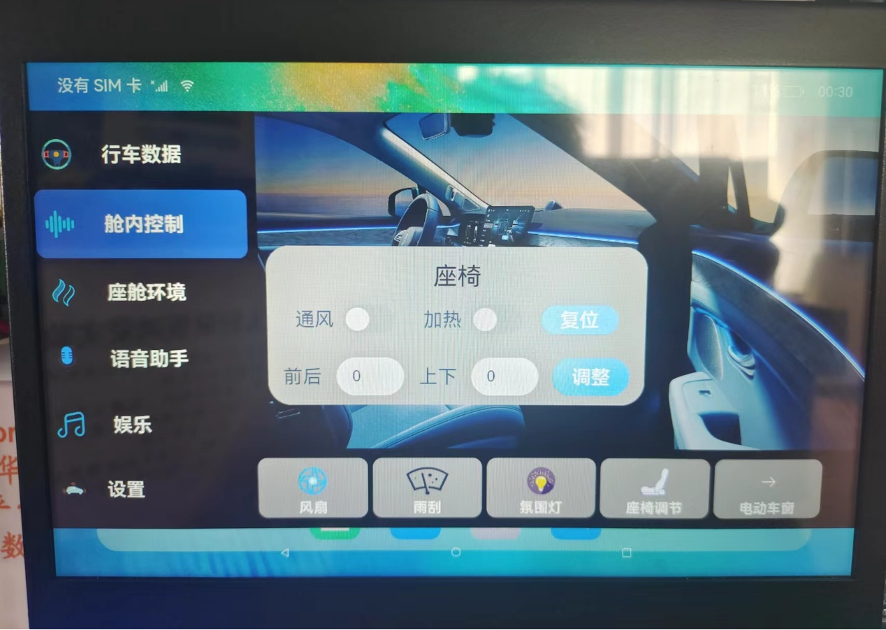 平台包含中控计算平台系统、鸿蒙车机及其显示器、视觉传感器、麦克风阵列、音响设备、座舱舱体(含座椅、雨刮、车窗、方向盘、刹车踏板、加速踏板)、超声波雷达、毫米波雷达等硬件,结合中控软件系统、鸿蒙车机软件、座椅控制程序,实现手势识别、人脸识别、语音交互、驾驶员疲劳驾驶检测、鸿蒙座椅远程调节、雨刮车窗控制、车载传感器监测、车机应用娱乐等功能。